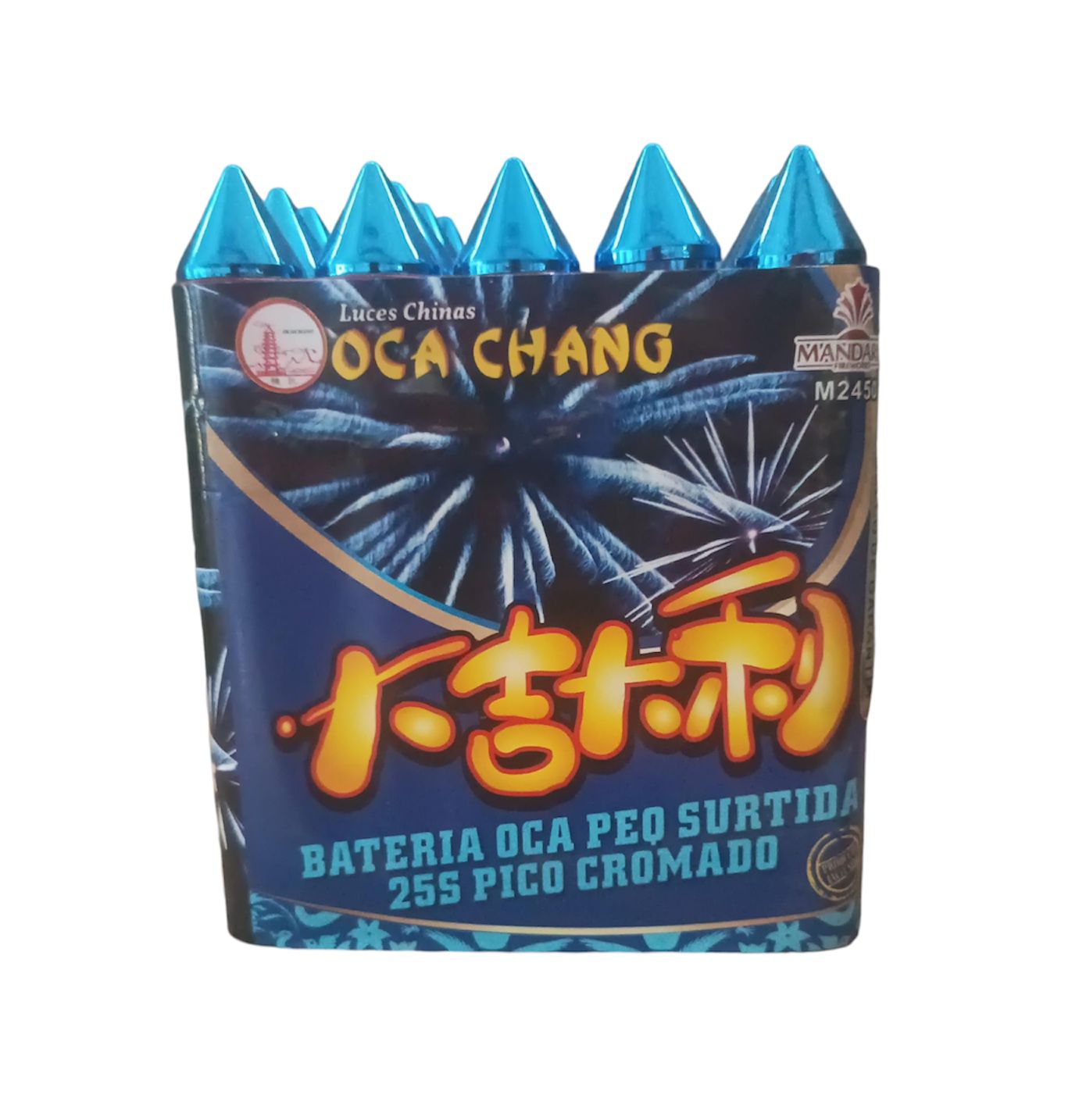 Nuestra batería OCA CHANG de 25 tiros azul es una creación exclusiva que te dejará sin aliento. Con múltiples efectos y un color intenso, este producto fabricado especialmente por nosotros te garantiza un show pirotécnico inolvidable.
